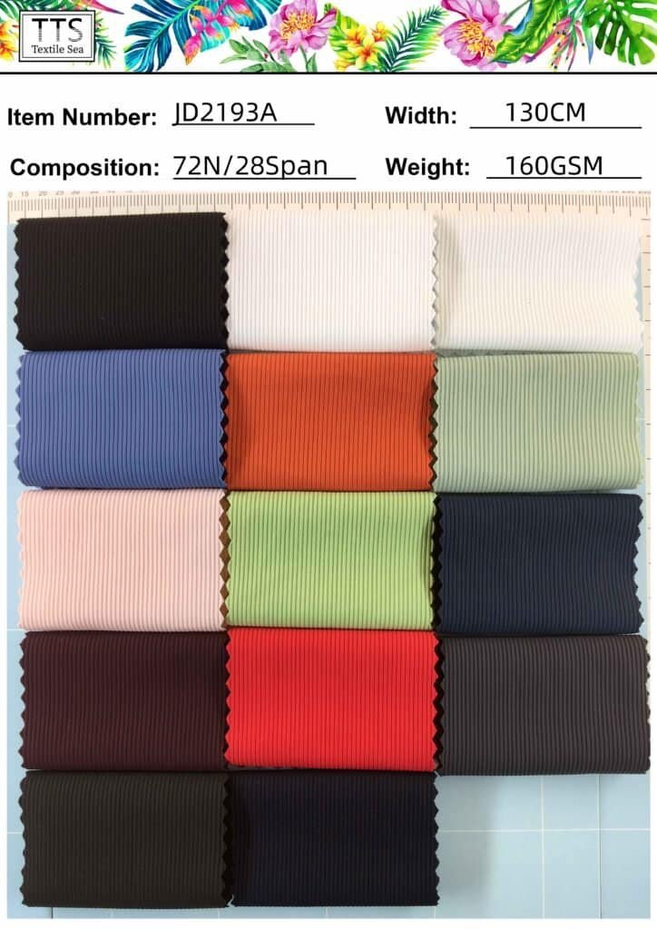 10, JD2193A# 72%Nylon/28%Spandex with 160gsm weight width 130cm. this ribbed yarn density more tightly although just 160gsm chickness but also not see though it also perfect for thin swimwear designs and accessories, still now there are already 31 solid colors update you can choose .