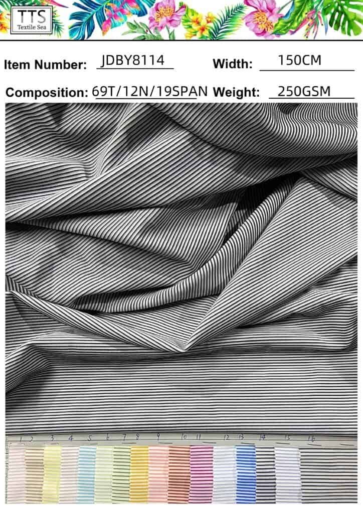 12, Item:JDBY8114# 69%Polyester/12%Nylon/19%pandex with 250gsm weight width150cm; this stretch ribbed fabric including three composition, the flat fabric is polyester composition and colored ribbed yarn is nylon spandex which not the printing color but dyeing two times for both nylon and polyester composition to use the warp knitting machine. now update 16 solid colors as you can choose