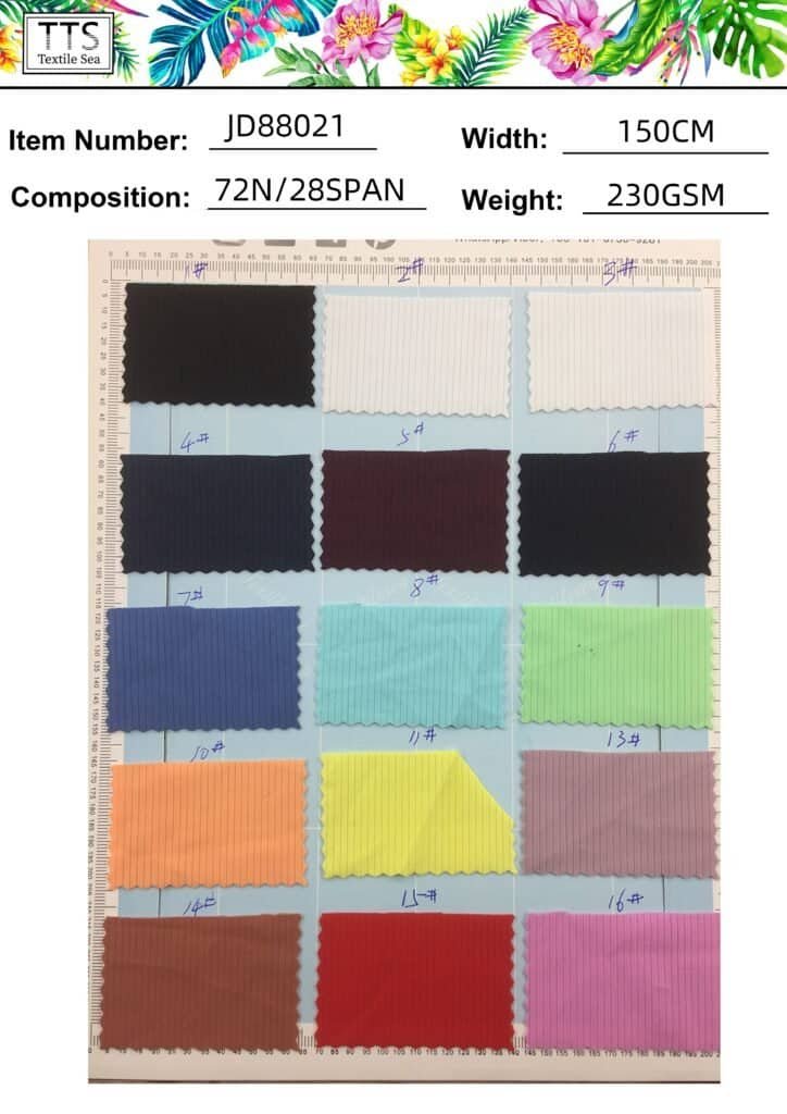 14, Item:JD88021# 72Nylon/28Spandex with 230gsm weight chickness width 150cm; this ribbed more heavier with highly stretch quality there are 16 solid colors as you can choose. more solid colors updating.
