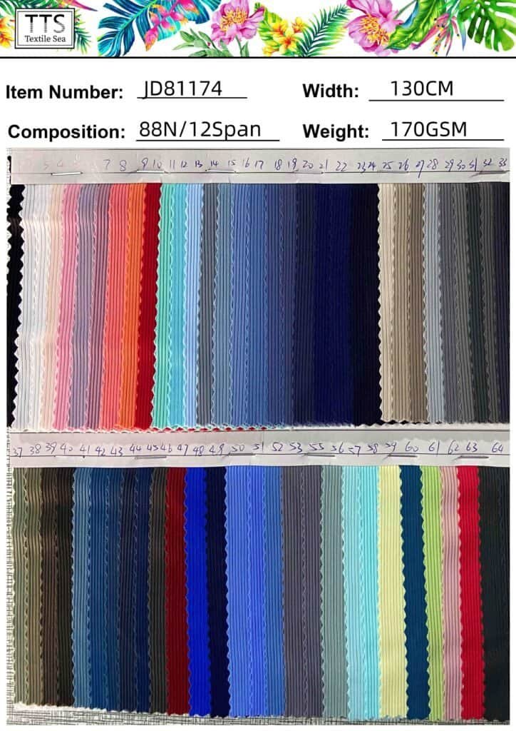 17, Item: JD81174# 88%Nylon/12%Spandex with 170gsm weight thickness width 130cm; there are 80 solid colors can match with our 180 nylon spandex solid fabric to design your swimwear, dancewear, or accesorries designs