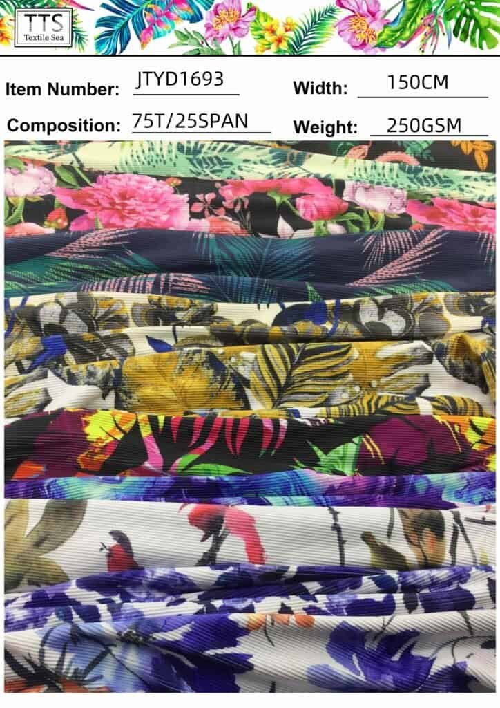 5, Item: JTYD1693 75%Polyester/25Spandex with 250gsm weight thickness width 150cm which perfect for swimwear, leggings designs not see through no minimal order quantites when print.